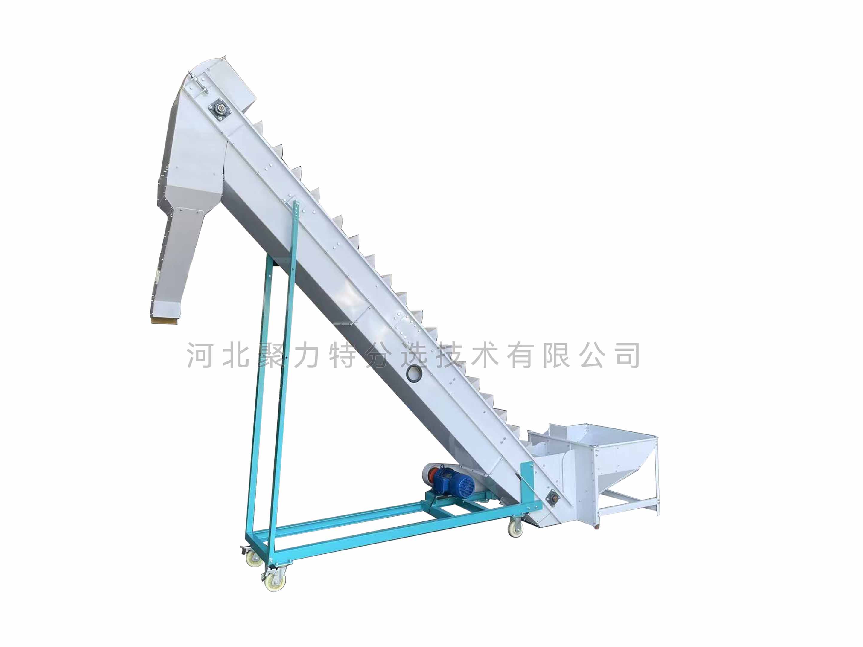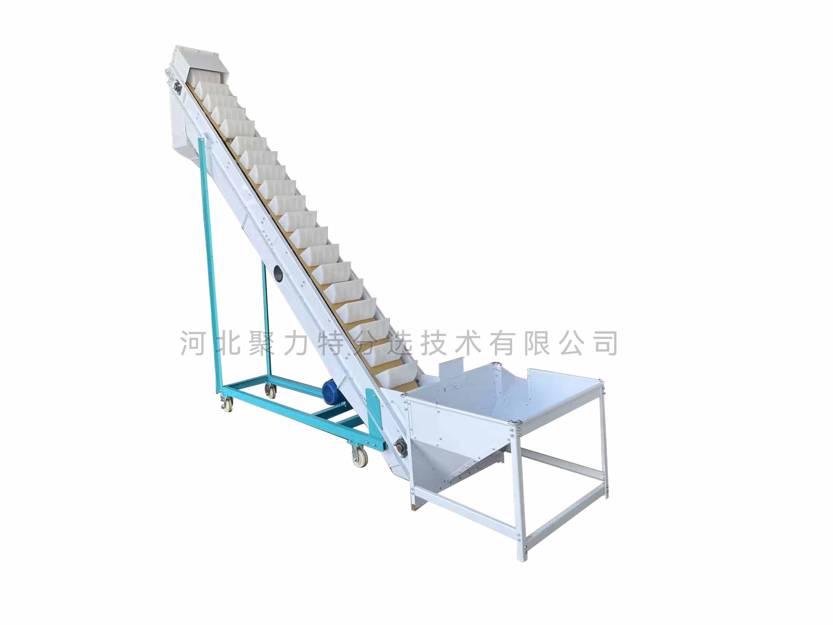 通過輸送皮帶輪和皮帶的運動來帶動料斗傾斜的上下運動,從而實現(xiàn)物料的斜向提升。