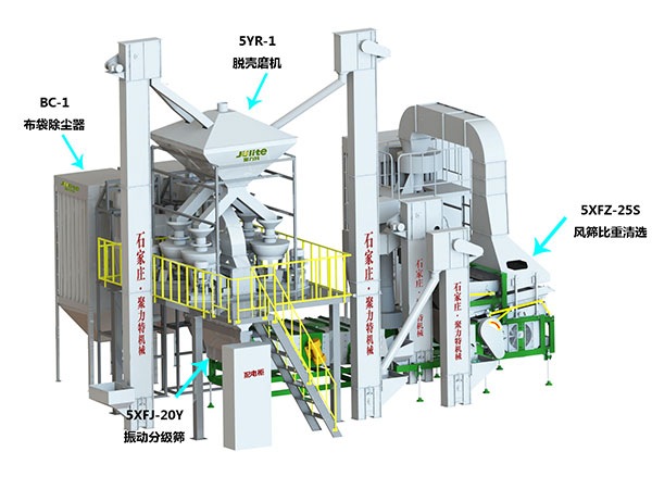 薏仁米脫殼分選生產(chǎn)線由脫殼磨機、風篩比重清選機、雙篩箱振動篩、風選系統(tǒng)、螺旋除塵器、提升機、原料倉、布袋除塵器、輔助設備(含電控系統(tǒng)、風網(wǎng)管道、輸料管道)等設備組成。
